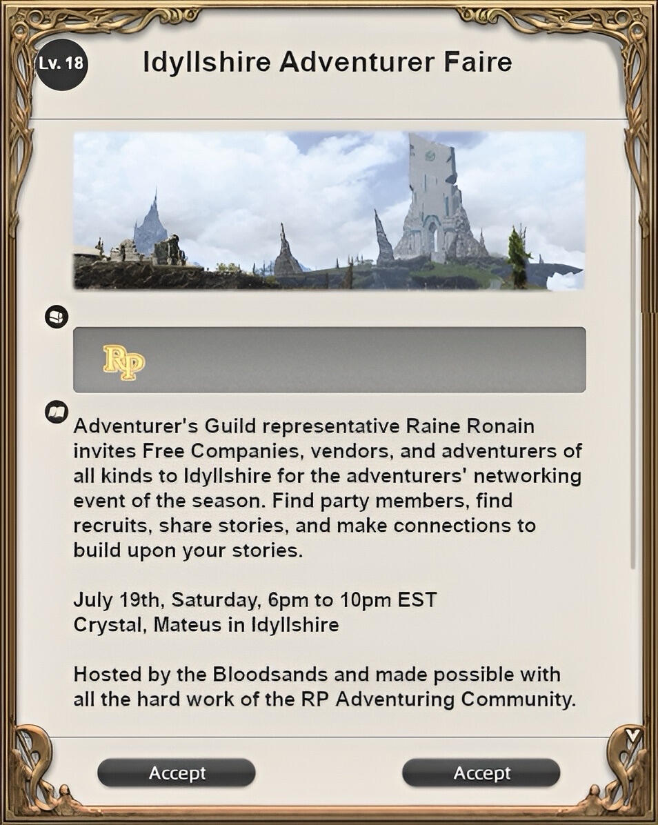 I'm new to the FreeCompany / Role playing, Where should I start? You can always start by visiting our venue or coming to our discord to seek roleplaying opportunities with the free company members in our LFRP channel. We even have a section for character prompts to help build you character if you have questions or want to open a discussion to in-game lore questions.