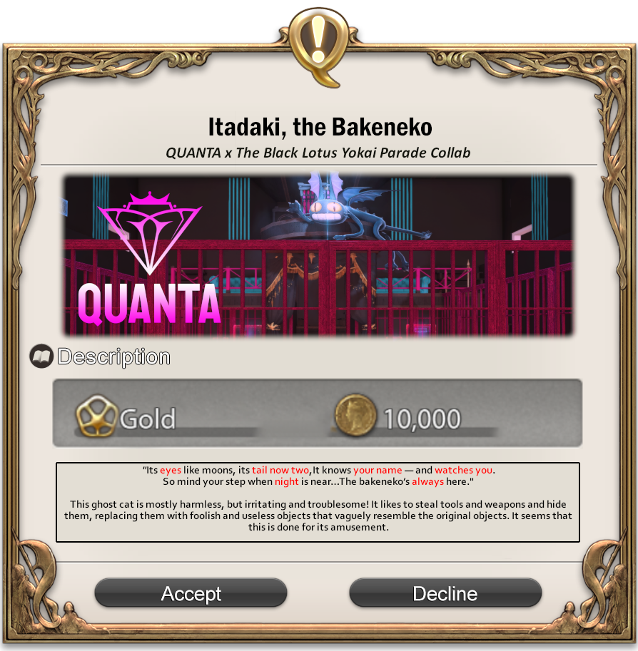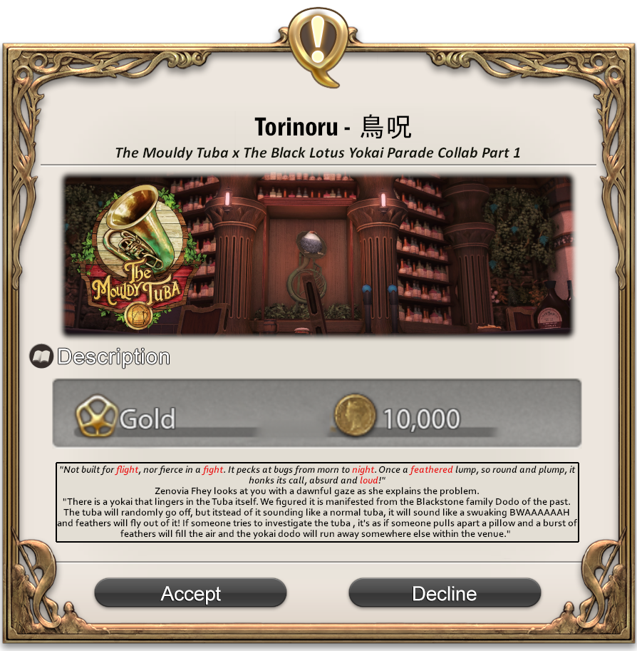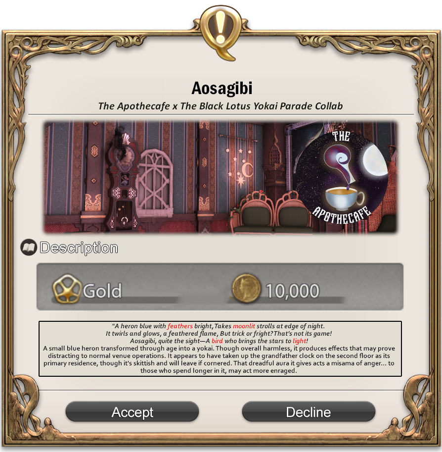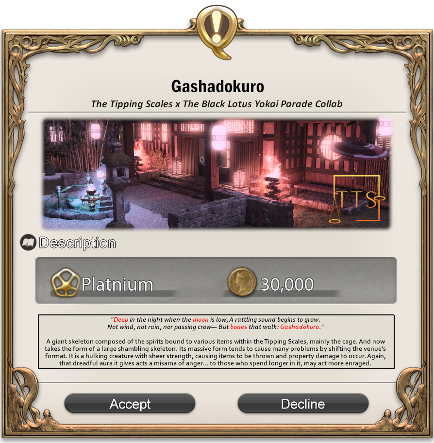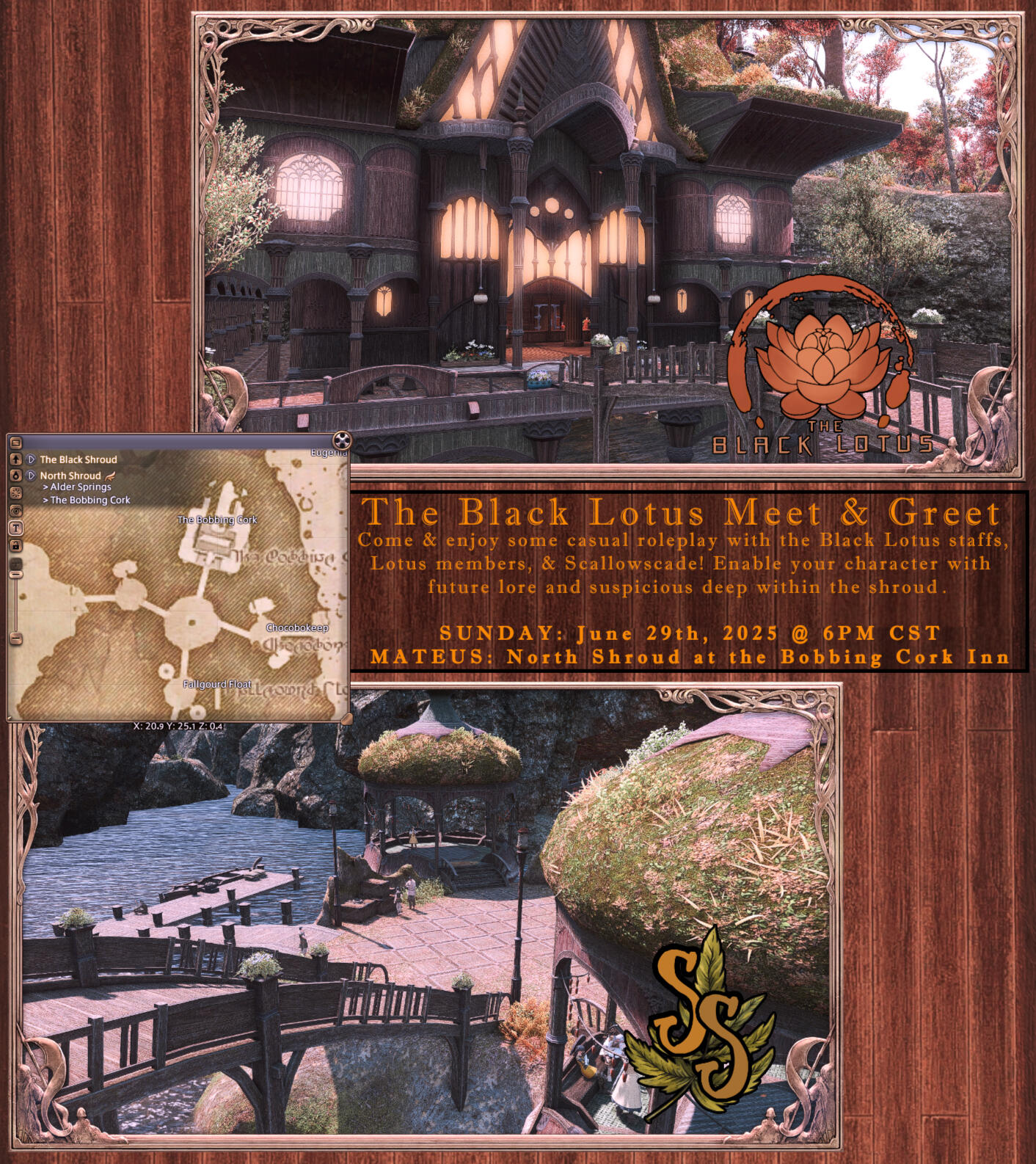 The Teahouse belongs to the Daisho House; A lesbian couple who only recently surfaced the streets of Kugane after buying some property in Shirogane. Unlike your traditional teahouse services, the black lotus takes a more modern approach to their socially-entwined tea masters providing a lively atmosphere for our guests whether it be singing, dancing, or socializing while conducting a wholesome tea ceremony.The Black Lotus venue is open on the first Sunday of every month:
