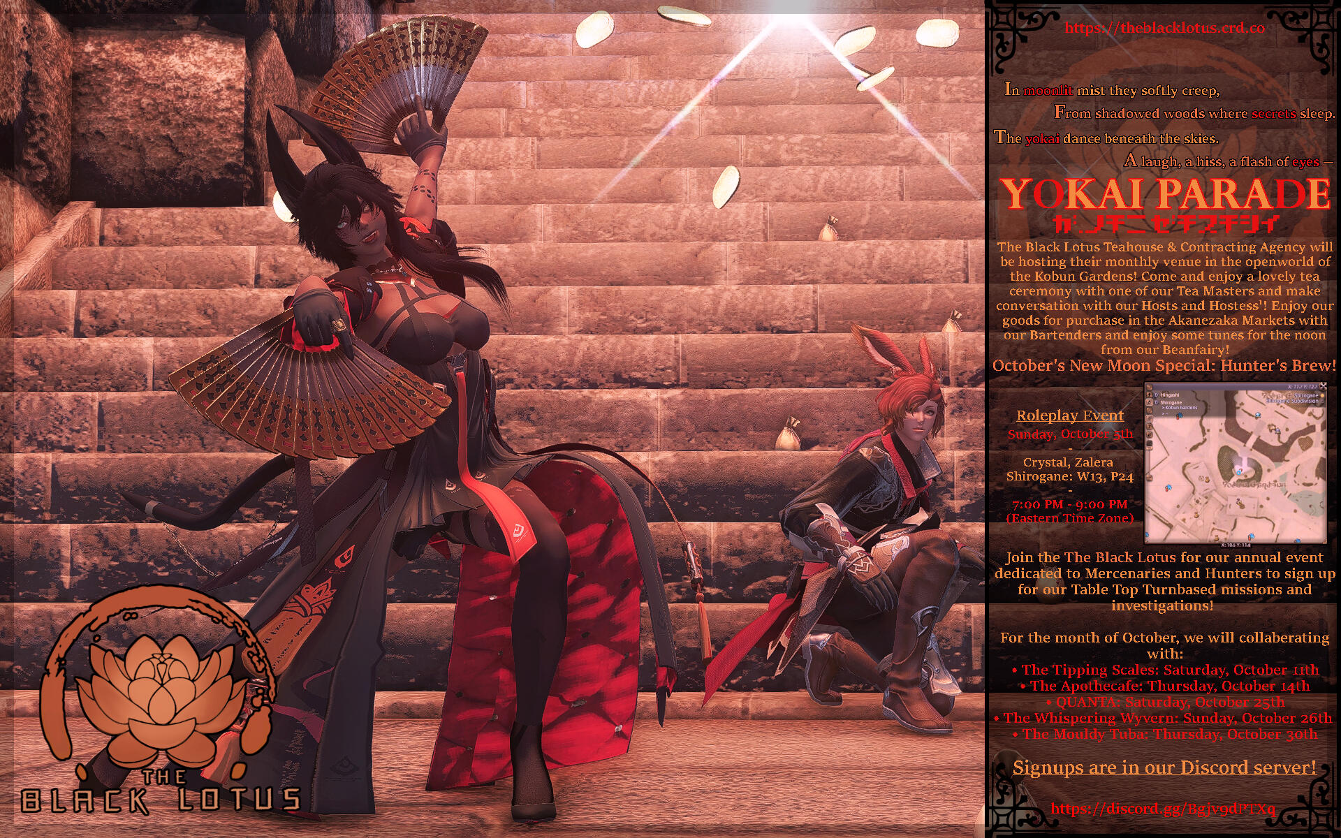 This is a SFW venue for the mature audience only. Welcoming new and/or experienced FFXIV roleplayers who enjoy in-character comfy-cozy Host/Hostesss kugane-themed teahouse that takes a dark turn into conflicts of interest that fall under criminal activity, bounty hunting, assassination, the Yakuza, yokai, priests/priestess, investigation, and more.Over all the Black Lotus offers a wide range of opportunities to the roleplay community. So if your character fits one or more of the themes above and you want to get involved, you can read more by continuing to the next page.Continue if you are 21 years old or older.