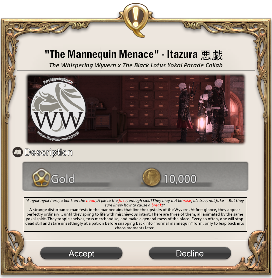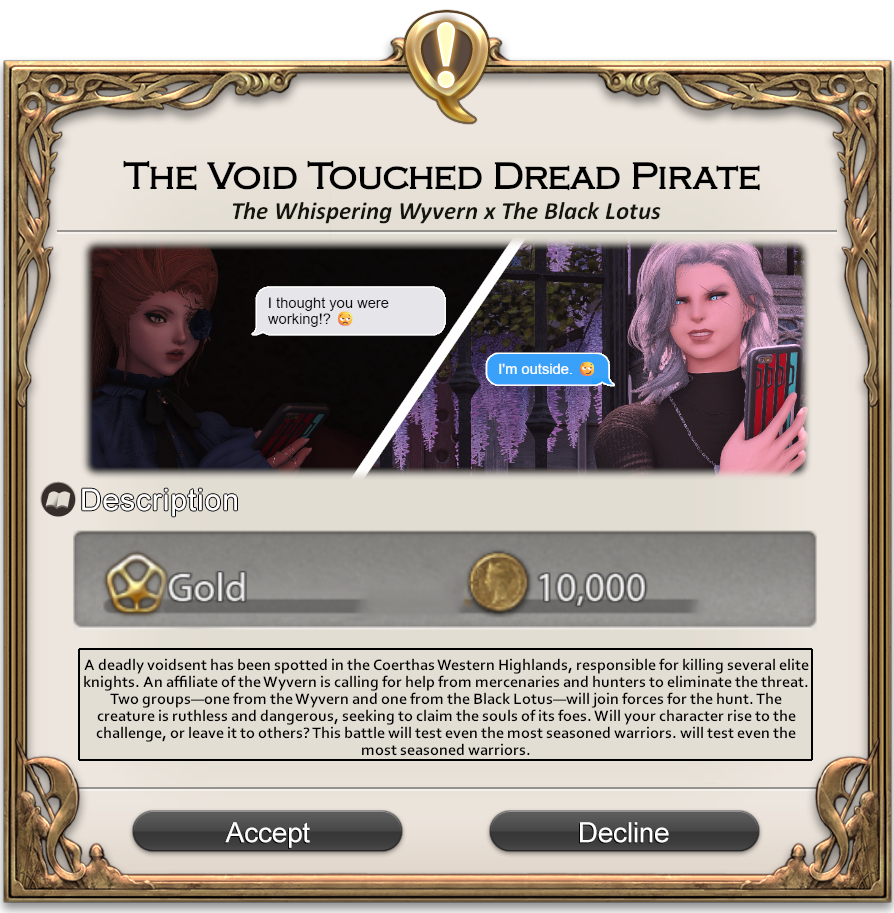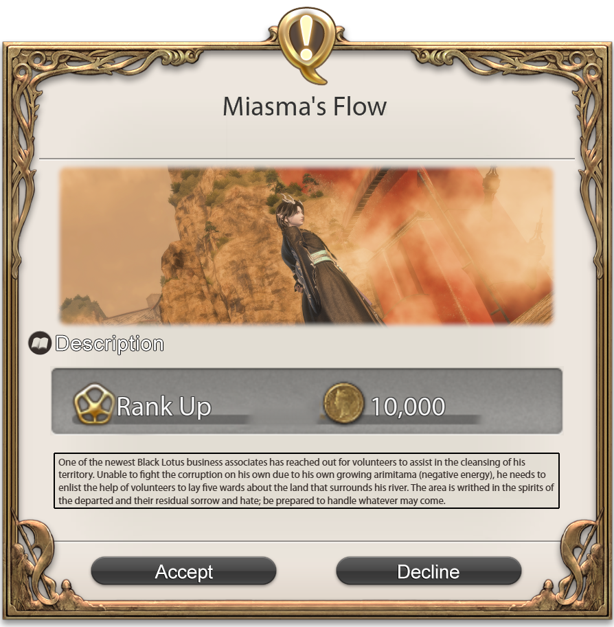 The Black Lotus now has its own exclusive bounty board that is exclusive to mercenaries, samurai, ninjas, etc looking for work and odd jobs for gil. This is exclusive to Black Lotus discord members only (and you do not need to be apart of the FC to register your characters). Advertisements of possible postings are lsited throughout Kugane and Ishgard for adventurers looking for work. |